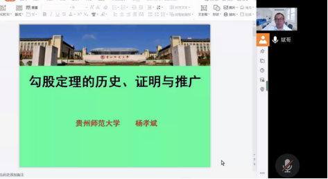 首先,杨孝斌老师向同学们介绍数学史所属的范畴,是研究数学发展进程及其规律的学科,是科学技术史的一个分支。其次,杨孝斌老师以“勾股定理的历史、证明与推广”为例,向同学们讲解了各大古文明中勾股定理的历史、勾股定理的多种证明方法,以及勾股定理的多种推广结论,介绍了《九章算术》中勾股定理历史名题在教材中的呈现,最后推荐了数学史的多本名著。