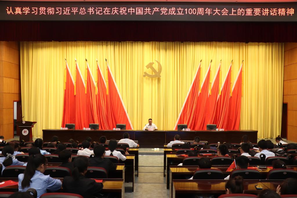 随后,孙谦以《牢记初心使命 坚定理想信念 努力为党和人民争取更大光荣》为题为全院师生上专题党课。他从“认真学习贯彻习近平总书记“七一”重要讲话精神”、“深刻认识开展党史学习教育的重大意义和主要目的”、“深刻认识推动高质量发展是强院兴院的必由之路”、“深刻认识全面加强党的建设是强院兴院的根本保证”四个方面展开党课。孙谦重点从读懂中国共产党的初心使命,“五个庄严宣告”见证中国共产党的伟大历史功绩,从“一种伟大精神”解密中国共产党的英勇奋斗伟力,从“九个必须”明确中国共产党的伟大历史使命等方面深入领学了习近平总书记在庆祝中国共产党成立100周年大会上的重要讲话精神。以史为鉴,开创未来,孙谦最后强调,公司全体党员要坚决响应习近平总书记和党中央号召:“牢记初心使命,坚定理想信念,践行党的宗旨,永远保持同人民群众的血肉联系,始终同人民想在一起、干在一起,风雨同舟、同甘共苦,继续为实现人民对美好生活的向往不懈努力,努力为党和人民争取更大光荣。”公司教职工要认真做实立德树人根本任务,扎实推进公司高质量发展,以优异的成绩迎接建校80周年,向建党100周年献礼。